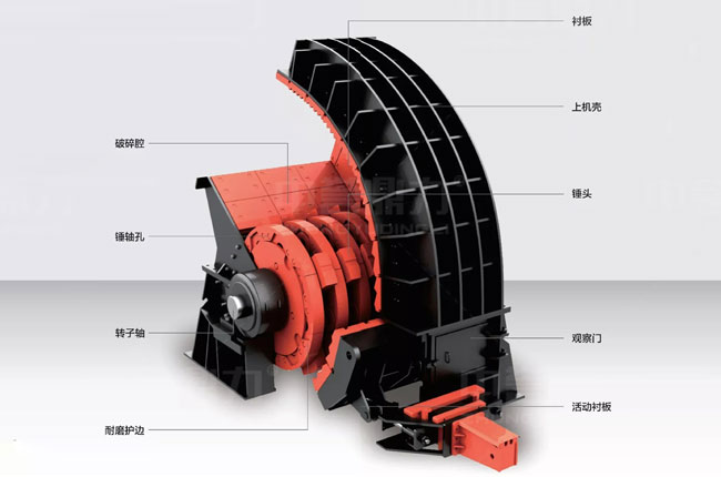 上圖就是重錘式破碎機的結構名稱了,主要由破碎腔、錘頭、襯板、護邊、錘軸孔、上機殼、觀察門、轉子軸、活動襯板等組成。