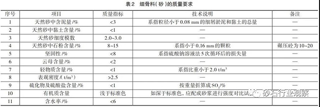 砂石骨料一般分為粗骨料和細骨料兩種,粒徑大于5mm的為粗骨料,小于5mm的為細骨料。粗骨料按粒徑80~150mm為特大石,40~80mm為大石,20~40mm為中石,5~20mm為細石;細骨料分為粗砂、中砂和細砂。骨料質量管理主要控制粗骨料的遜徑和細骨料的石粉含量及細度模數,混凝土用砂石骨料加工,質量要求詳見下表。