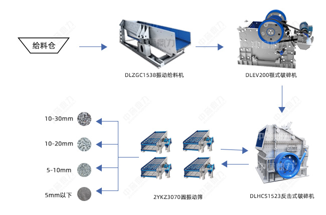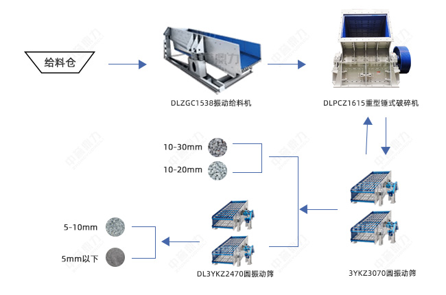 破碎環節只用一臺DLPCZ1615重型錘式破碎機,既用來做粗碎,也用來加工頭道篩的返料,取代傳統兩段破碎,較大程度上減少設備投資成本,頭道篩出10-30mm、10-20mm兩種成品料,二道篩出5-10mm、5mm以下石粉兩種成品料。