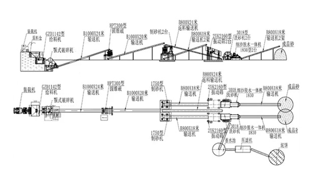 一套完整的時產150噸機制砂生產線不僅包括制砂環節,還包括大塊物料的粗、細碎作業,DLZSJ1238雙轉子制砂機和DLVSI1140立軸沖擊式制砂機都可用于機制砂生產線,根據物料硬度大小合理設計加工工藝,生產高質量機制砂。