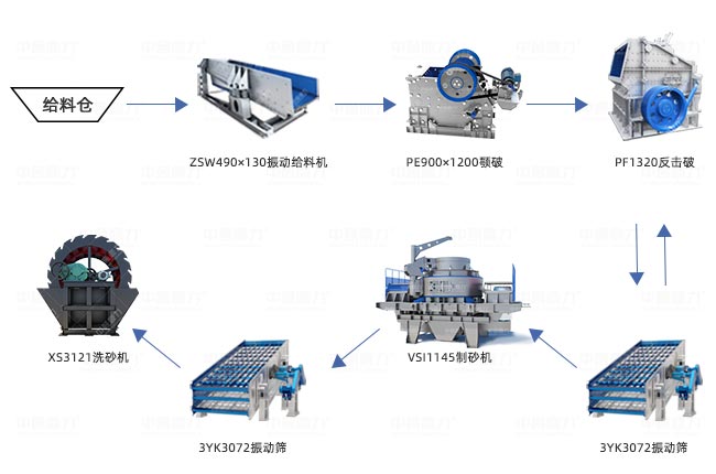 配置設備:ZSW490×130振動給料機、PE900×1200顎破、PF1320反擊破、VSI1145制砂機、3YK3072振動篩*2臺、XS3121洗砂機。