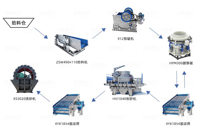 設備搭配:ZSW-490×110振動給料機、912鄂破機、HPM300圓錐破、HVI1040制砂機、4YK1854振動篩*3臺、3020洗砂機*3臺