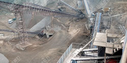 石料生產線在工作過程中,大塊石料經料倉由振動給料機均勻地送進重型錘式破碎機進行粗碎,粗碎后的石料由皮帶輸送機送入錘式破碎機(或反擊式破碎機)進行中碎,中碎后的石料由膠帶輸送機送進振動篩進行篩分,符合規格的石料和成品砂子(篩下物)由膠帶輸送機送至成品料堆;不符合規格的大顆粒石料(篩上物)由皮帶輸送機返回至錘式破碎機再次進行破碎處理,破碎后的石料再經過膠帶輸送機送進振動篩進行篩分,這樣形成閉路多次循環。