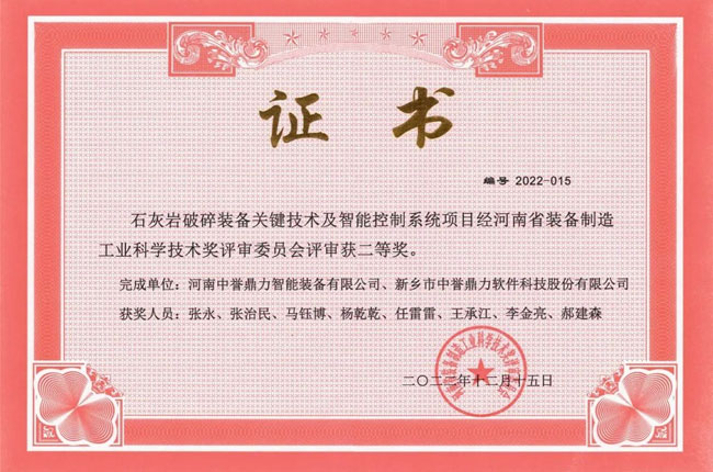 根據河南省裝備制造業協會、河南省高新技術企業協會《關于開展2022年度河南省裝備制造業科學技術獎工作的通知》(豫裝制協【2022】04號)文件要求,經河南省裝備制造工業科學技術獎評審委員會評審,河南中譽鼎力智能裝備有限公司與新鄉市中譽鼎力軟件科技股份有限公司共同研發的石灰巖破碎裝備關鍵技術及智能控制系統項目獲河南省裝備制造業科學技術獎二等獎。