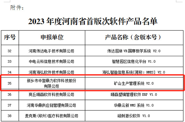 7月20日-26日,河南省工業和信息化廳對2023年度河南省首版次軟件產品認定結果進行公示,新鄉市中譽鼎力軟件科技股份有限公司創新研發的“礦山生產管理系統 V2.0”順利通過認定!