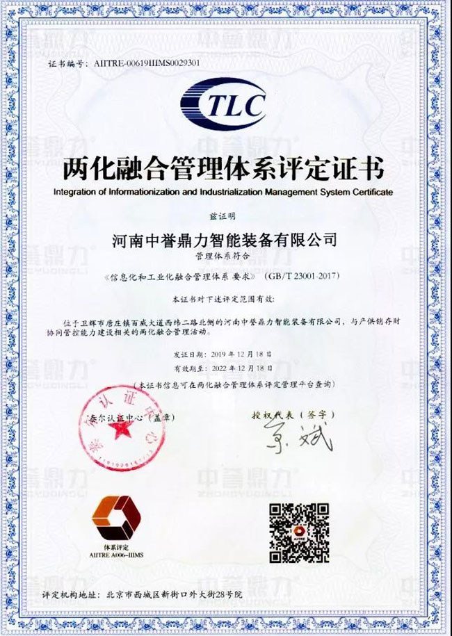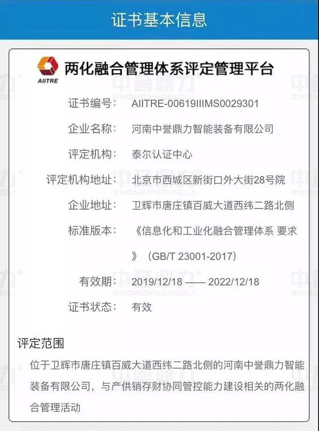 日前,河南中譽鼎力智能裝備有限公司正式通過兩化融合管理體系貫標認證,取得工信部的評定機構(gòu)頒發(fā)的“兩化融合管理體系評定證書”。
