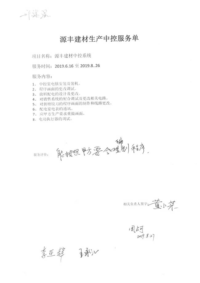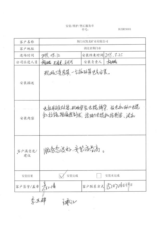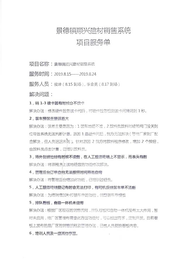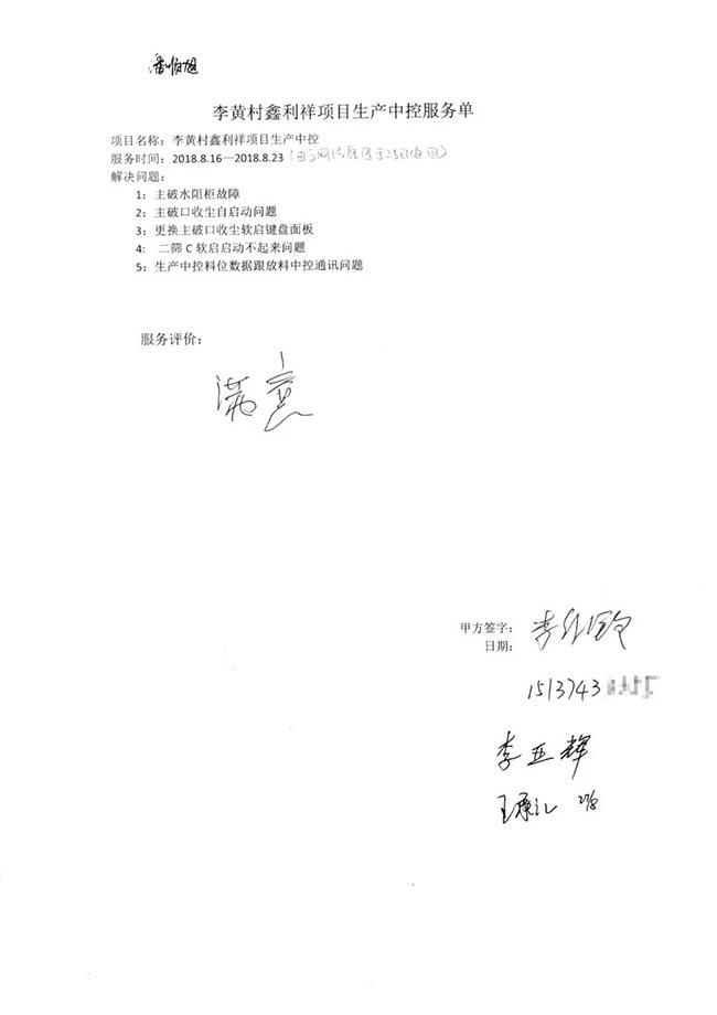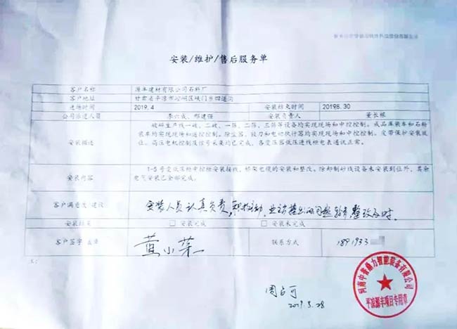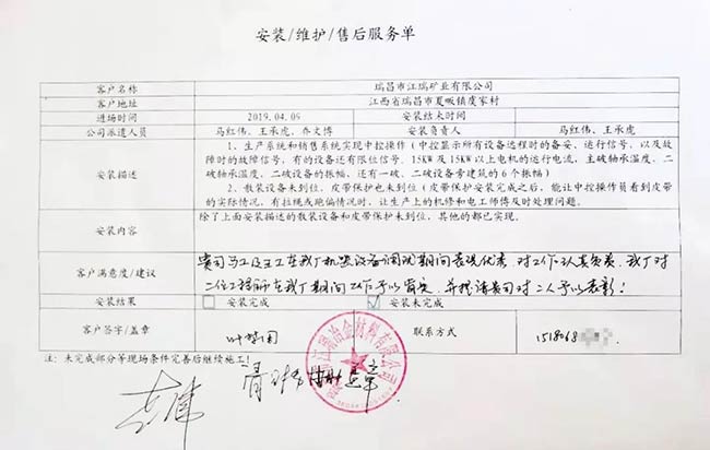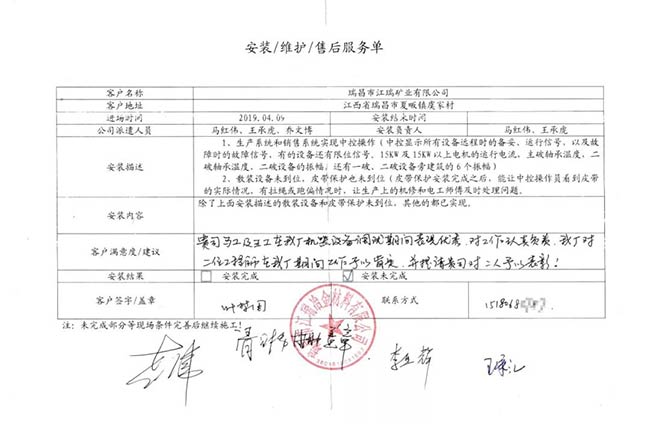 與客戶打交道的過程,不僅有電氣成套設備、低壓配電柜、礦山骨料生產線的管理軟件的安裝調試,還有監控設備工程、電氣工程的施工等等。咨詢,設計,施工,調試,維護,培訓……如何做到每一個環節都精益求精,達到客戶要求?完善的質量管控和服務體系不可少。而“項目服務單”就是其中一項重要措施,記載并參與了服務的過程。