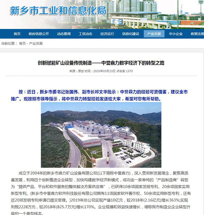 3月19日,新鄉(xiāng)市工信局發(fā)布了一篇題為《創(chuàng)新賦能礦山設(shè)備傳統(tǒng)制造——中譽(yù)鼎力數(shù)字經(jīng)濟(jì)下的轉(zhuǎn)型之路》的文章。新鄉(xiāng)市委書記張偉、副市長祁文華批示:中譽(yù)鼎力的經(jīng)驗(yàn)可資借鑒,建議市推廣,并詳細(xì)介紹了中譽(yù)鼎力的轉(zhuǎn)型經(jīng)驗(yàn)。