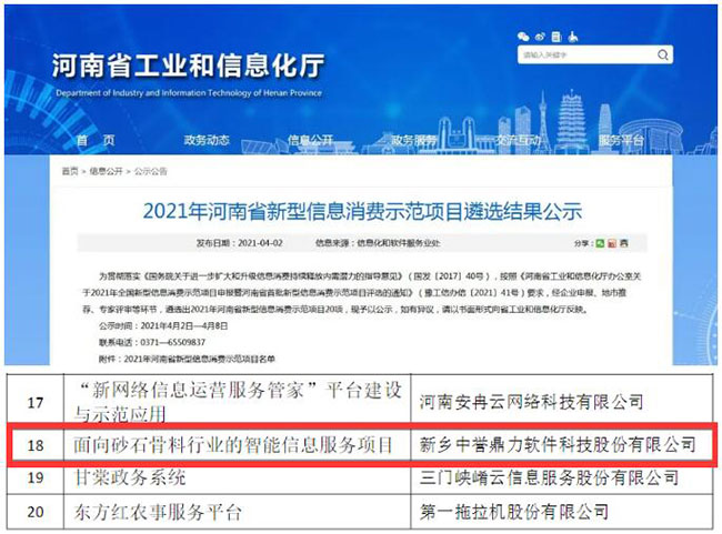 近日,河南省工信廳信息化和軟件服務業處對2021年河南省信息消費項目遴選結果進行公示。新鄉市中譽鼎力軟件科技股份有限公司“面向砂石骨料行業的智能信息服務項目”成功入選名單,并順利通過公示。