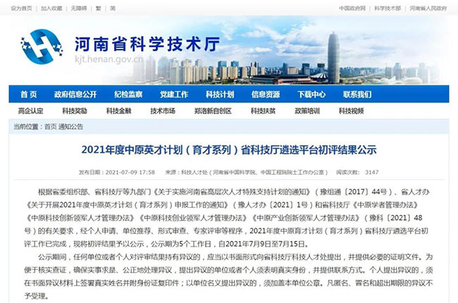 根據河南省委組織部、省科技廳等九部門《關于實施河南省高層次人才支持計劃的通知》(豫組通〔2017〕44號)、省人才辦《關于開展2021年度中原英才計劃(育才系列)申報工作的通知》(豫人才辦〔2021〕1號)和省科技廳《中原學者管理辦法》《中原科技創新軍人才管理辦法》《中原科技創業軍人才管理辦法》《中原產業創新軍人才管理辦法》(豫科〔2021〕48號)的有關要求,經個人申請、單位、形式審查、評審等程序,7月9日,2021年度中原育才計劃(育才系列)省科技廳遴選平臺初評工作完成,并將結果予以公示。