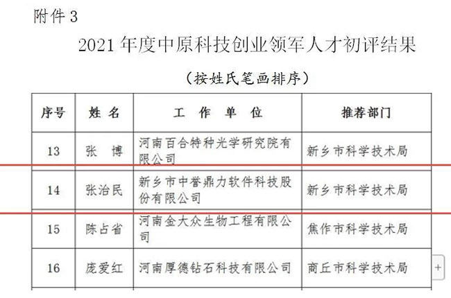 經新鄉市科學技術局,新鄉市中譽鼎力軟件科技股份有限公司董事長張治民成功入選2021年度“中原科技創業軍人才”名單,并順利通過公示!