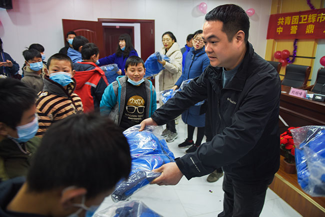 河南中譽(yù)鼎力智能裝備有限公司常務(wù)副總張志宇為學(xué)生分發(fā)棉衣