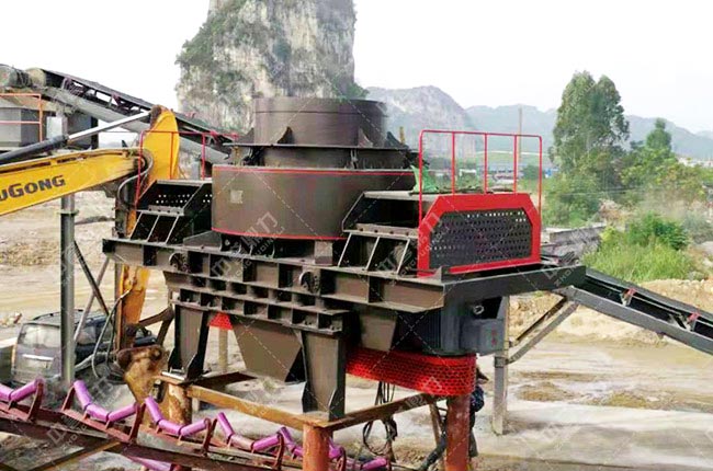 石料由機(jī)器上部直接落入高速旋轉(zhuǎn)的轉(zhuǎn)盤,在高速離心力的作用下,與另一部分以傘型方式分流在轉(zhuǎn)盤四周的靶石產(chǎn)生高速度的撞擊與高密度的粉碎,石料在互相打擊后,又會在轉(zhuǎn)盤和機(jī)殼之間形成渦流運(yùn)動而造成多次的互相打擊、磨擦、粉碎,從下部直通排出。形成閉路多次特環(huán),由篩分設(shè)備控制達(dá)到所要求的粒度。