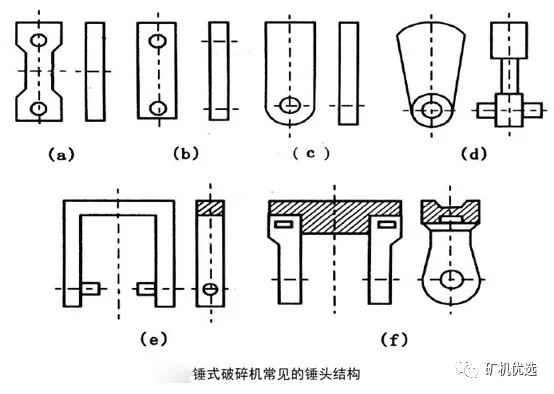 上圖中(a)、(b)、(c)是輕型錘頭,質(zhì)量通常為3.5~15.0kg,多用于破碎塊度為100~200mm的軟質(zhì)和中硬物料。其中(a)、(b)兩種是兩端帶孔的,磨損后可以調(diào)換4次;而(c)種錘頭只能換2次。(d)為中型錘頭,質(zhì)量為30~60kg,且距懸掛較遠(yuǎn),多用于破碎800~1000mm的中硬物料;而(e)、(f)是重型錘頭,其質(zhì)量為50~120kg,主要用來(lái)破碎大塊且堅(jiān)硬的物料。