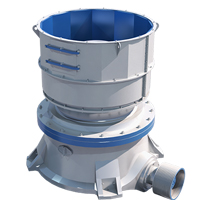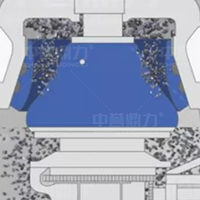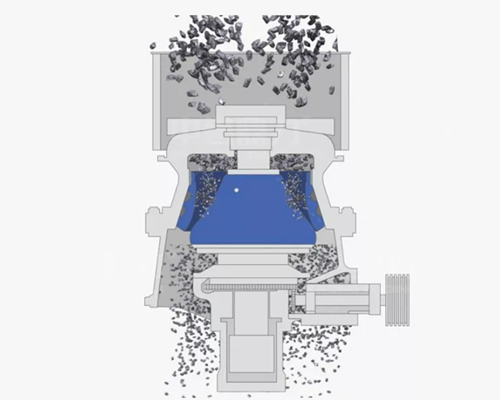 水平軸在電機(jī)帶動下旋轉(zhuǎn),通過齒輪帶動偏心套旋轉(zhuǎn),偏心套帶動動錐做圓錐擺動,與定錐形成連續(xù)擠壓,達(dá)到破碎石塊的目的。 通過調(diào)整動錐底部的液壓缸,可以使動錐上下運(yùn)動,從而控制排礦口的大小,進(jìn)而達(dá)到調(diào)成產(chǎn)品粒度大小的目的。液壓缸具有過鐵保護(hù)功能,當(dāng)有不可破碎物進(jìn)入破碎腔,液壓缸控制動錐下落,不可破碎物下落排出后,動錐自動恢復(fù),設(shè)備恢復(fù)到正常工作狀態(tài)。