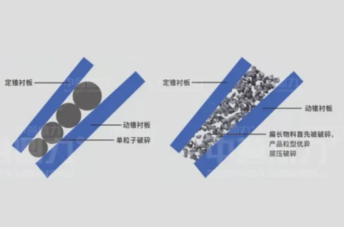 通過采用粒間層壓原理設(shè)計,利用物料間相互擠壓,扁長物料先被破碎,可以提高破碎效率和細(xì)料比例,在很大程度上減少針片狀物料,產(chǎn)品粒形好,并且易損件鋼耗小;