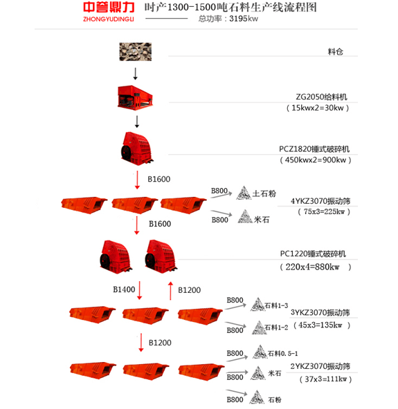 • 設(shè)備配置:ZG2050振動給料機、PCZ1820重型錘式破碎機、4YKZ3070振動篩*3臺、PC1220錘式破碎機等