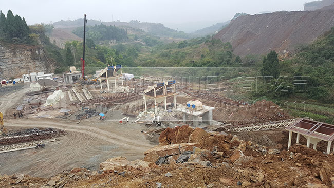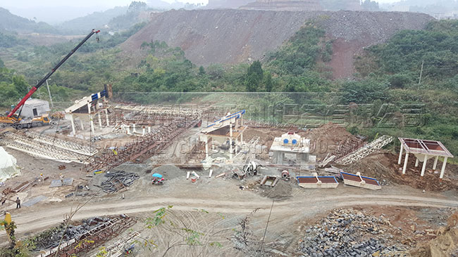 此條時產600噸砂石料生產線主要包括2臺重錘破、11臺篩分設備、2臺ZSJ1218制砂機,并且配備有完備的中轉倉和環保除塵設備,設備產能是比較大,預計設計的產能是500噸,在實際的生產中達到了600-700噸,生產效果良好。