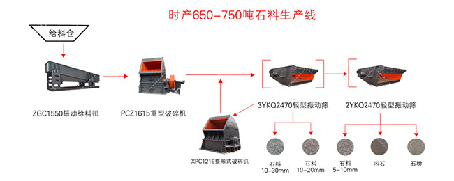 選用設(shè)備:ZG2050給料機(jī),PCZ1615錘式破碎機(jī)*2,2YKZ2460振動(dòng)篩*6和輸送帶等設(shè)備。
