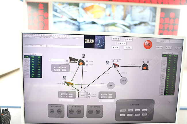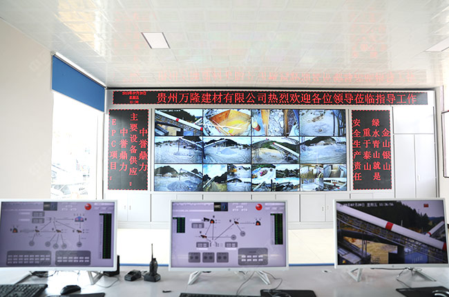 貴州省萬隆建材生產(chǎn)線砂石生產(chǎn)智能管理系統(tǒng)的總控制室,各設備的生產(chǎn)畫面掌控