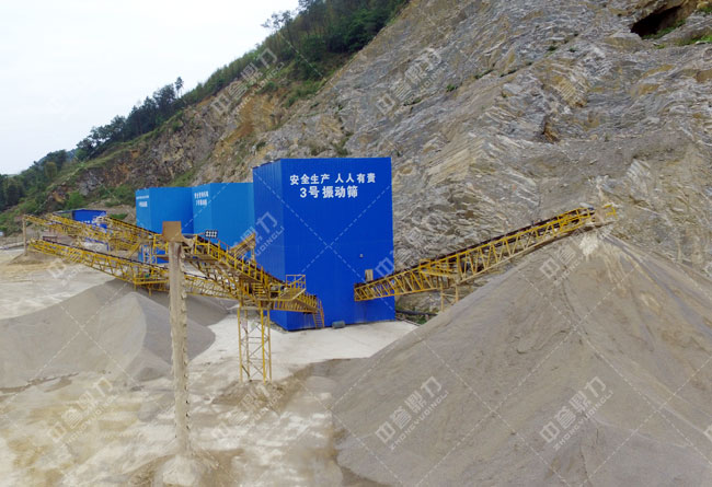 搭配:原料堆、SC160圓錐式破石機(移動式)、HVI1250制砂機、2YK2460篩分機械、3020砂石洗選設備(2臺),依據場地顆粒配備運送機若干。