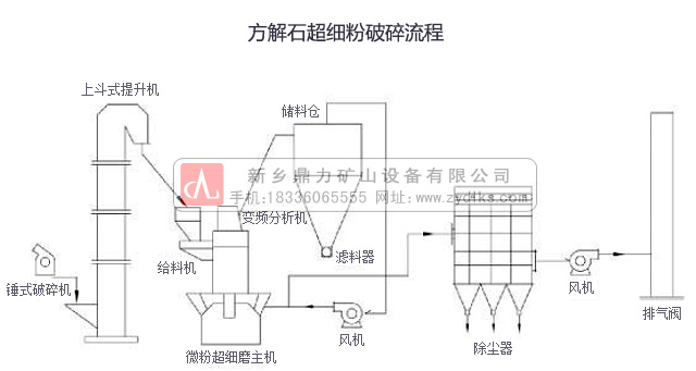 根據(jù)客戶對于方解石的產品質量要求,配置對應的生產線,如果是單單需要比較大顆粒的方解石成品料的話,只需要經過我們公司破碎機設備的簡單破碎過程,就可以將成品料輸送出來,但是對于要求比較細的話,只配置上破碎機設備,不能達到終的要求,對于細度需要達到多少目的話,須配置上的磨粉機設備,一般來說生產的大致流程是這樣的,先經過錘式破碎機的破碎流程,然后使用上斗式提升機將成品料提升到儲料倉內,然后經過振動給料機的輸送,輸送到細磨設備內,便完成了生產的過程,要的時候,需要配置上旋風集粉器和脈沖除塵設備,大致的生產過程如下圖: